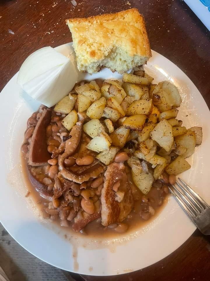 Folks, if you won’t eat, or have never eaten, a meal like this, then you just aren’t an Appalachian hillbilly. This plate is as honest and simple as it gets: pinto beans cooked to perfection with rich hog jowl bacon, fried taters with onion in them, and a wedge of cornbread served with a quarter of a big sweet onion on the side. It’s the kind of meal that fills your belly, warms you up from the inside out, and makes you feel right at home.