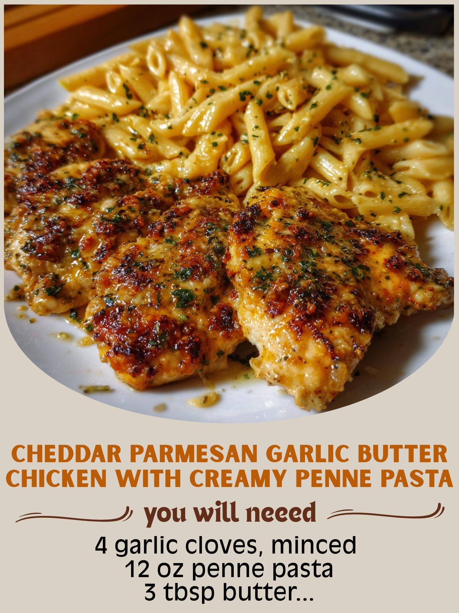 Cheddar Parmesan Garlic Butter Chicken with Creamy Penne Pasta