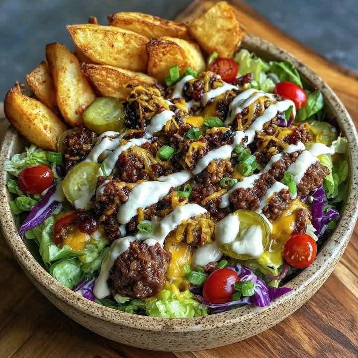 Cheeseburger Salad Bowls These Cheeseburger Salad Bowls combine all the best parts of a classic burger—juicy seasoned beef, melty cheese, crisp lettuce, and tangy burger sauce—into a fresh, low-carb meal. Perfect for a quick weeknight dinner or lunch prep, these bowls deliver the full comfort of a cheeseburger without the bun. Each bite is crunchy, … Lire plus