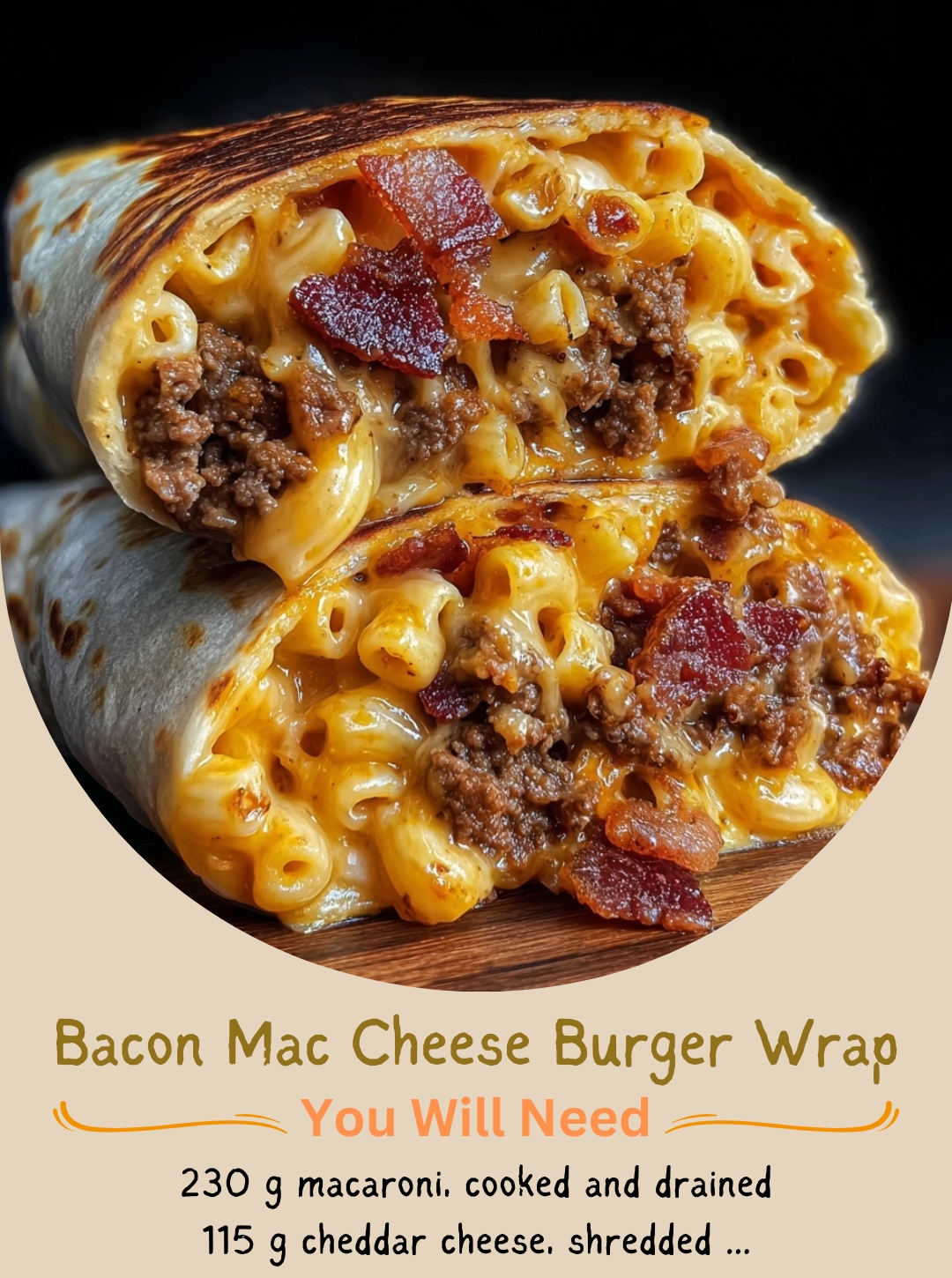 A hearty, indulgent wrap loaded with seasoned ground beef, crispy bacon, cheesy macaroni, and fresh lettuce—all bundled in a warm tortilla. It’s like a bacon cheeseburger meets mac & cheese, wrapped for the ultimate comfort-food handheld!