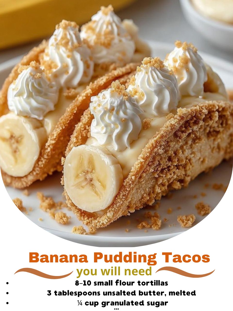 These Banana Pudding Tacos bring all the flavors you love from traditional banana pudding but in a more portable, hand-held form. The crispy taco shells add a wonderful texture contrast to the smooth, creamy pudding and soft bananas. Topped with whipped cream and a sprinkle of cinnamon or vanilla wafers, these dessert tacos will bring a smile to anyone who takes a bite!