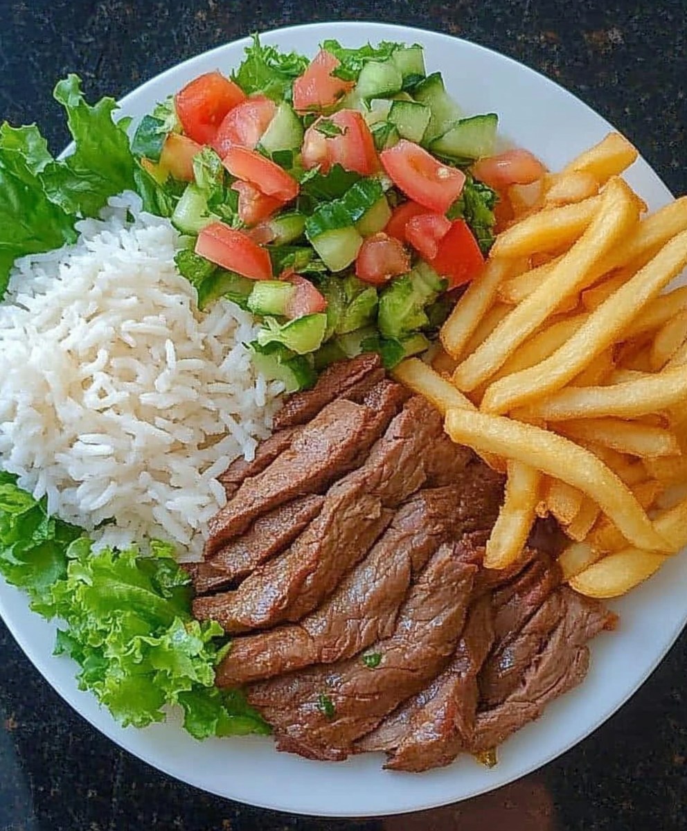 This hearty, colorful plate is inspired by everyday Brazilian home cooking — a balanced and flavor-packed combination of tender sautéed beef with onions, crispy fries, fluffy white rice, creamy seasoned beans, and a vibrant chopped salad. It’s a dish that hits every craving: savory, crunchy, fresh, and comforting, all in one wholesome, satisfying meal.
