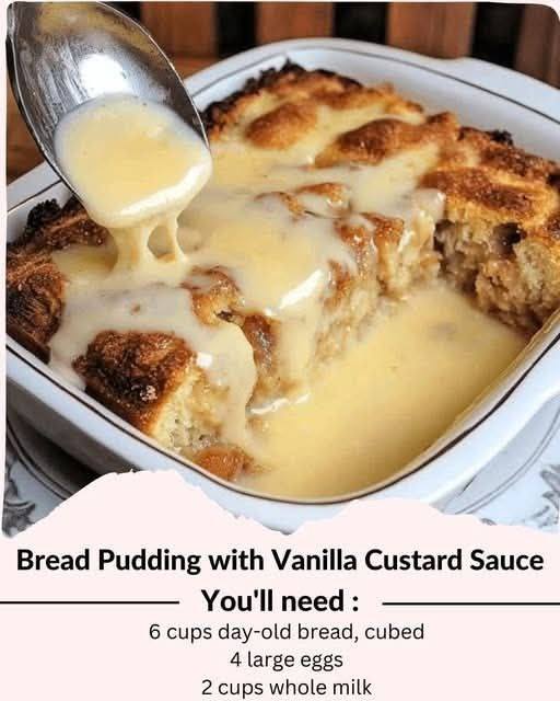 This Bread Pudding with Vanilla Custard Sauce is the epitome of comfort food — rich, creamy, and perfectly spiced with cinnamon and nutmeg. Soft, custard-soaked bread bakes into a golden, slightly crisp top, while the luscious vanilla custard sauce adds an irresistible silky sweetness. It’s an old-fashioned dessert that never goes out of style and is ideal for cozy family gatherings, brunch, or holiday dinners.