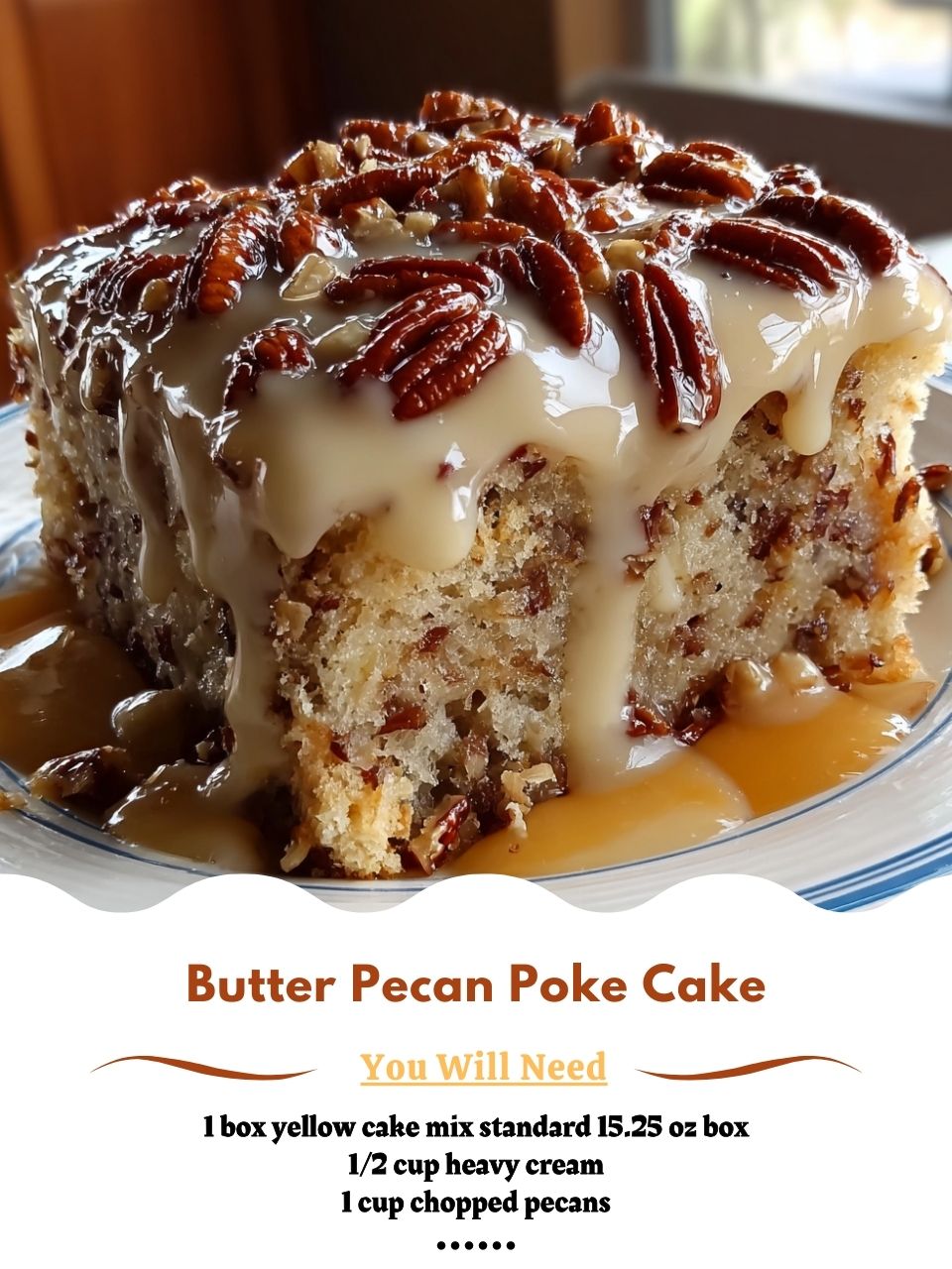 Butter Pecan Poke Cake is a rich, sweet, and buttery dessert with warm toasted pecans, a moist yellow cake base, and creamy filling soaked into every bite. The « poke » technique allows a luscious cream mixture to seep into the cake, making it extra decadent. It’s a perfect crowd-pleasing cake for holidays, potlucks, or any time you want comfort in a slice!