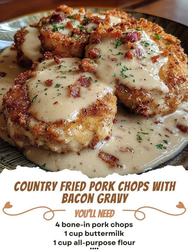 Country Fried Pork Chops with Bacon Gravy is a classic Southern comfort dish that combines crispy, golden-brown fried pork chops with a rich, creamy bacon gravy. The pork chops are perfectly seasoned and fried to a crispy, crunchy texture, while the bacon gravy adds an indulgent, savory depth to each bite. This dish is the epitome of Southern soul food, delivering the ultimate combination of flavors and textures. Whether served for a hearty weeknight dinner or a weekend feast, Country Fried Pork Chops with Bacon Gravy is sure to be a crowd-pleaser!