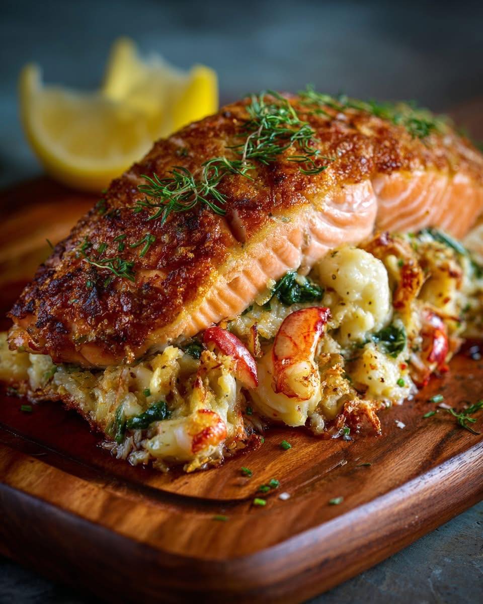 This luxurious stuffed salmon features a delicious filling of crab meat, shrimp, and a creamy blend of cheeses, all tucked into a perfectly seasoned salmon fillet. Baked to flaky perfection and garnished with fresh dill and lemon wedges, itβs a restaurant-quality meal thatβs surprisingly easy to make at home!