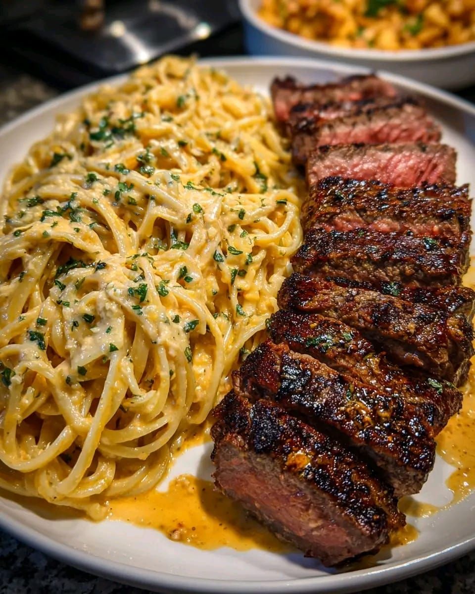 Creamy Garlic Pasta with Steak is a luxurious yet simple dish that pairs tender, juicy steak slices with rich, garlicky cream sauce and perfectly cooked spaghetti. It’s an indulgent meal that feels like a restaurant-worthy plate but comes together easily in your own kitchen. Perfect for date night, family dinners, or any time you’re craving bold, savory comfort food.