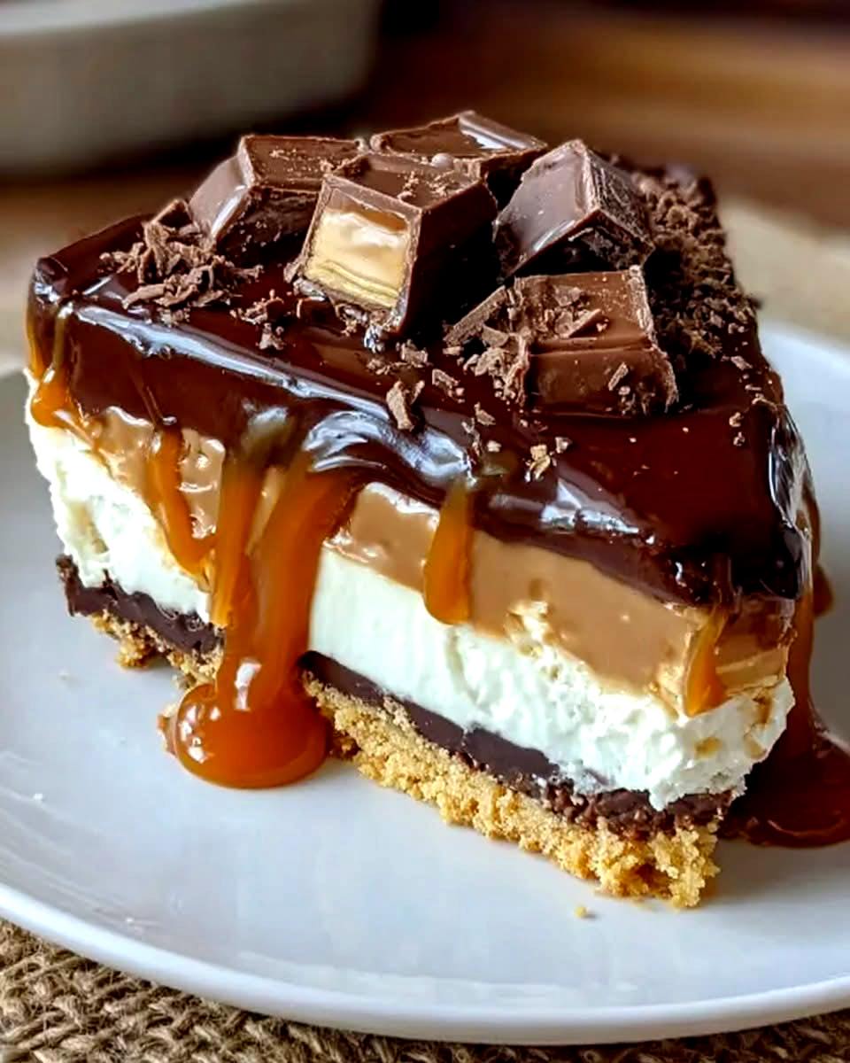 The combination of crushed cookies and melted butter forms a sturdy base, while the creamy filling blends gentle sweetness with caramel richness. Twix pieces add crunch and flavor, making each bite layered and texturally satisfying.