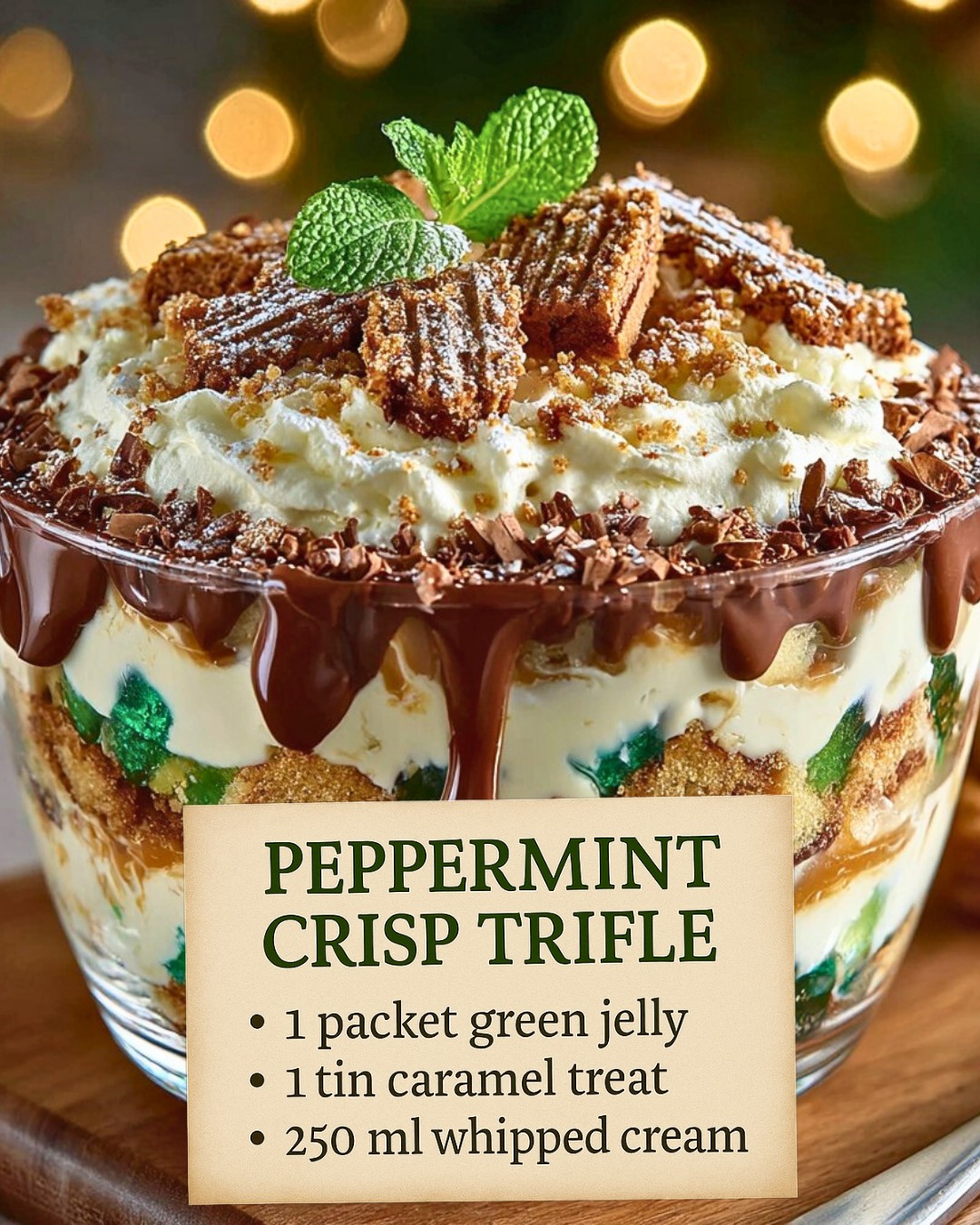 This Decadent Caramel Peppermint Trifle is a show-stopping dessert that combines layers of soft sponge cake, sweet caramel, whipped cream, and a burst of minty chocolate. The green jelly adds a refreshing twist, while the crushed Peppermint Crisp bar gives each bite an irresistible crunch. Whether you’re preparing it for a special occasion or just a cozy dessert for family and friends, this trifle is sure to impress with its layered goodness and delightful flavors.
