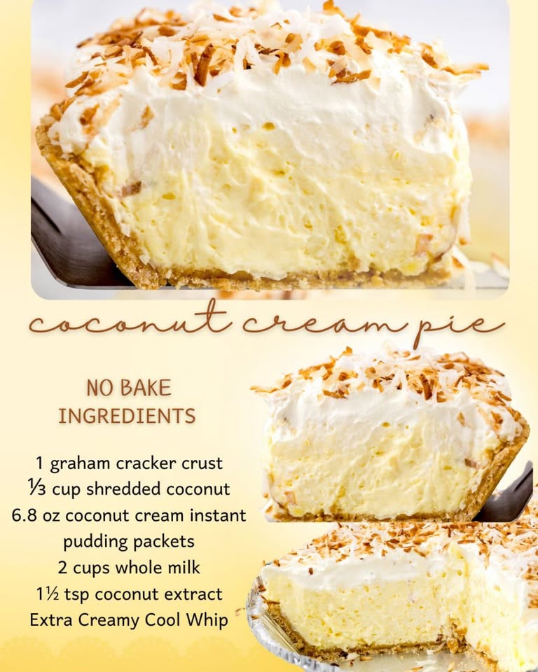 Looking for a quick and delicious dessert that’s packed with flavor? This Yummy and Easy No-Bake Coconut Cream Pie is just what you need! With a creamy coconut filling, a sweet graham cracker crust, and a cool, refreshing texture, this pie is the ultimate treat for coconut lovers. The best part? It requires no baking, so you can whip it up in no time and enjoy its deliciousness without having to turn on the oven. Perfect for summer parties, holidays, or any time you want a simple yet decadent dessert!