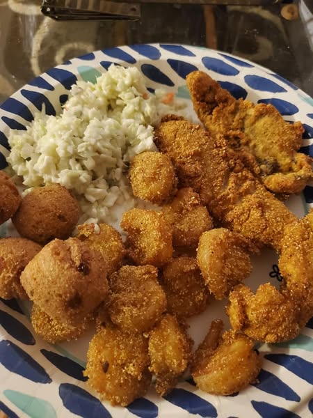 Fried crappie, fried shrimp, coleslaw, and hush puppies — you’ve just summed up the kind of fresh-caught supper that brings everyone to the table fast. This simple lineup highlights the natural flavor of the fish and shrimp while keeping the sides classic and comforting. When everything is cooked hot and crisp, with cool coleslaw on the side and golden hush puppies straight from the fryer, it’s the kind of meal that feels both timeless and deeply satisfying.