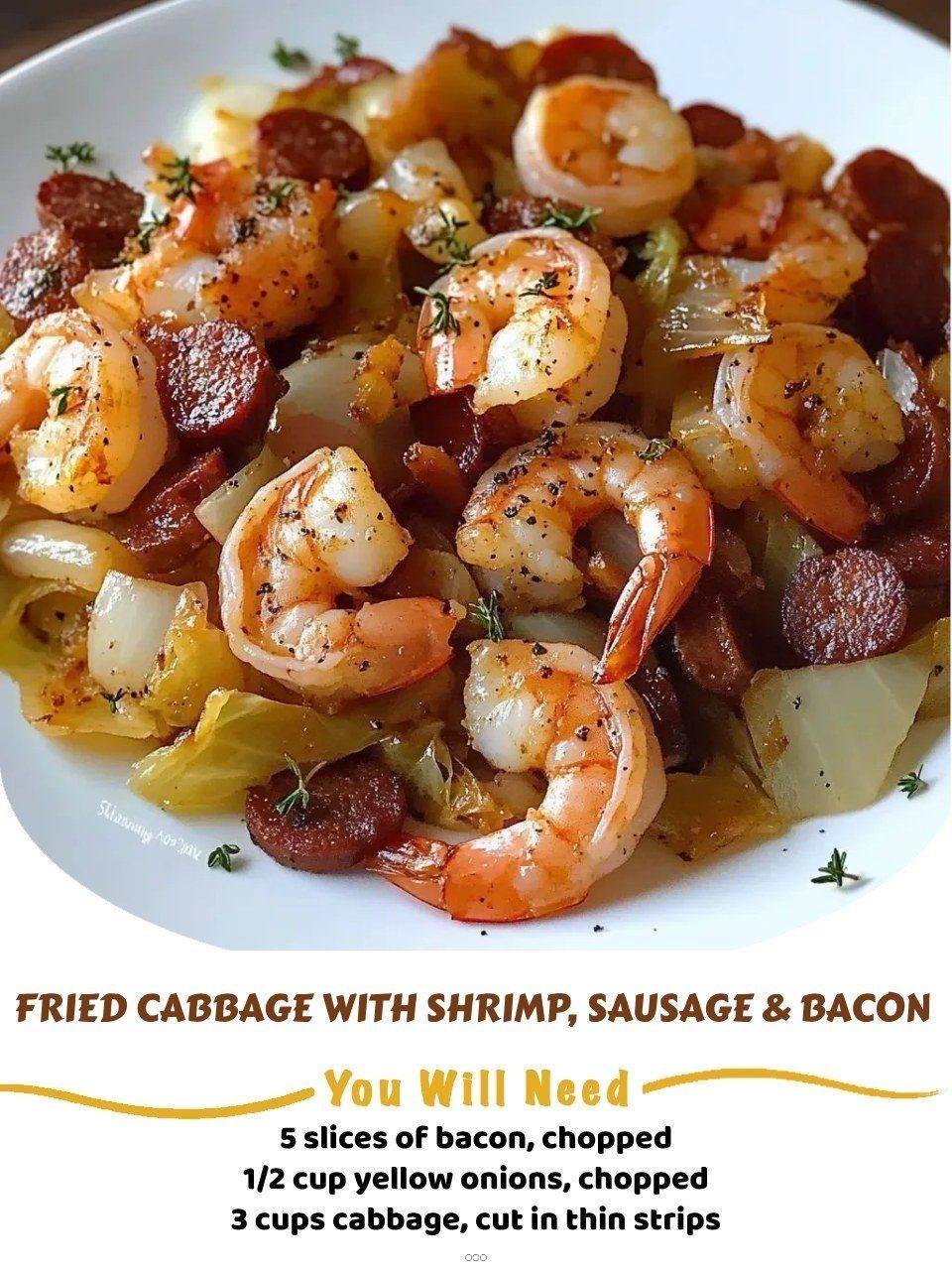 😍🔥 Smoky, savory, and full of flavor — this Fried Cabbage with Shrimp, Sausage & Bacon is Southern comfort in one skillet! Crispy bacon, juicy shrimp, tender sausage, and sautéed cabbage come together for a hearty, low-carb meal that’s quick, easy, and downright addictive. It’s a flavor-packed one-pan dish perfect for weeknight dinners or Sunday feasts!