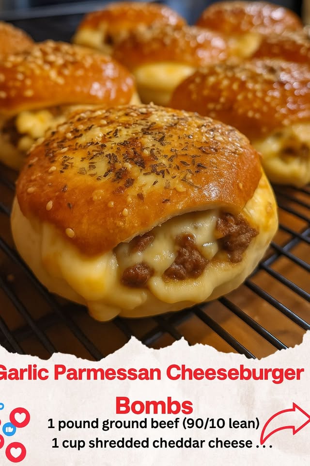 These Garlic Parmesan Cheeseburger Bombs are everything you love about a classic burger—juicy beef, melted cheese, and savory seasoning—all wrapped up in a soft, golden biscuit with a buttery garlic-Parmesan crust. Perfect as a party appetizer, game-day snack, or quick dinner, these handheld bites burst with flavor and gooey cheese in every bite.