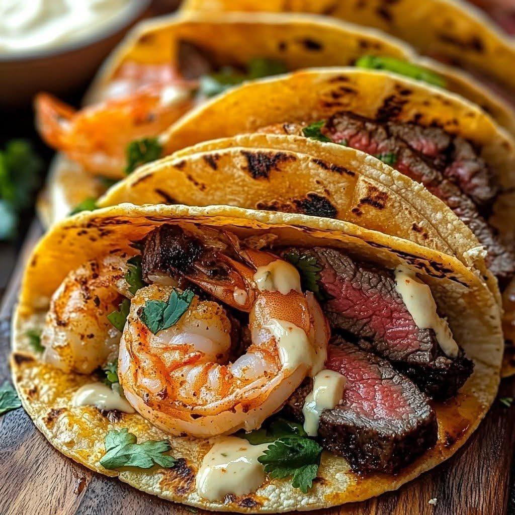 These gourmet surf and turf tacos bring together tender, well-seasoned steak and buttery, garlicky shrimp for a luxurious twist on classic street tacos. Each tortilla holds a balance of smoky beef, juicy seafood, melted cheese, and bright cilantro, all finished with a spicy chipotle sauce and a creamy dipping sauce on the side. The combination of textures and flavours—warm tortillas, rich proteins, cooling toppings, and citrus brightness—makes these tacos feel both indulgent and incredibly satisfying.