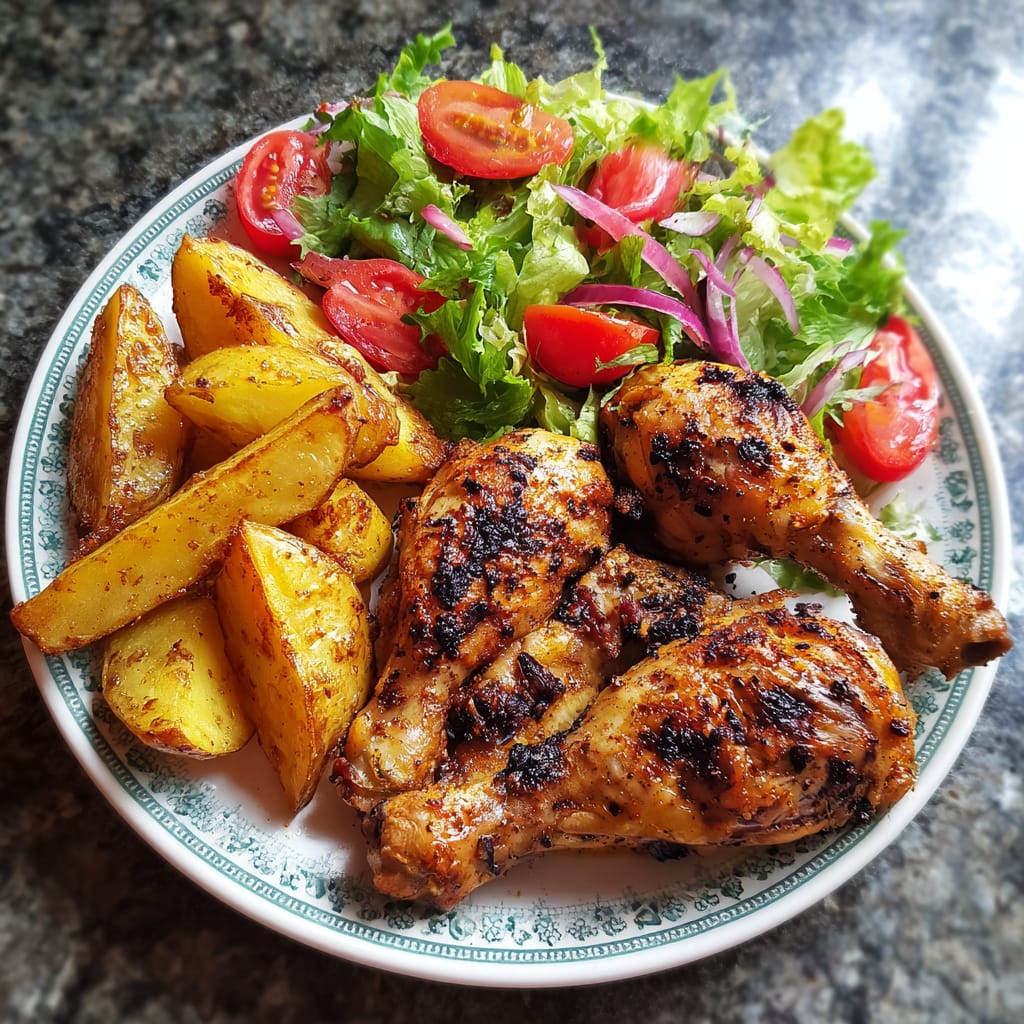 This hearty, balanced meal of Grilled Chicken Drumsticks with Crispy Potato Wedges and Fresh Salad is flavorful, easy to prepare, and ideal for family dinners or weekend cookouts. The drumsticks are marinated in a smoky, garlicky blend and grilled to juicy perfection. Served with oven-roasted golden wedges and a bright, refreshing salad, it’s a wholesome plate full of color, crunch, and satisfaction.