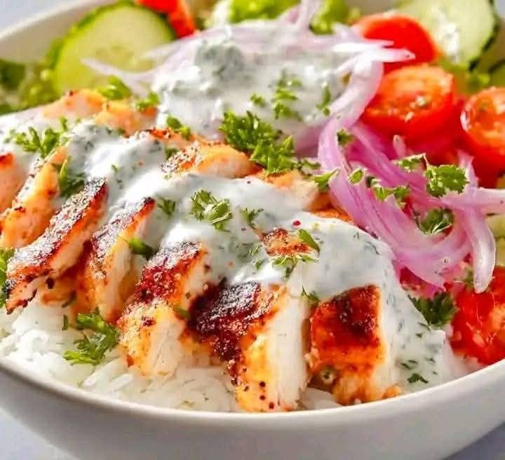 Grilled Chicken Rice Bowl with Garlic Yogurt Sauce — a wholesome, Mediterranean-inspired meal that’s both refreshing and satisfying. Juicy grilled chicken, fluffy basmati rice, crisp veggies, and a tangy garlic yogurt sauce come together in one vibrant, nutrient-packed bowl. Perfect for lunch, dinner, or meal prep! 🍚🥒🍅