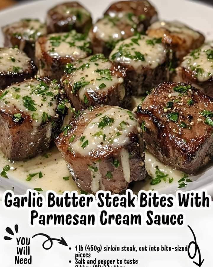 This Garlic Butter Steak Bites with Parmesan Cream Sauce recipe creates tender, juicy steak pieces seared in rich garlic butter, then coated in a silky Parmesan cream sauce. It’s fast, comforting, and perfect for weeknight dinners or special meals. The browned steak bites pair beautifully with the savory, cheesy sauce, making this an irresistible dish to serve over pasta, rice, potatoes, or with warm crusty bread. Below is an expanded, detailed version of the original recipe while keeping every measurement and instruction intact.