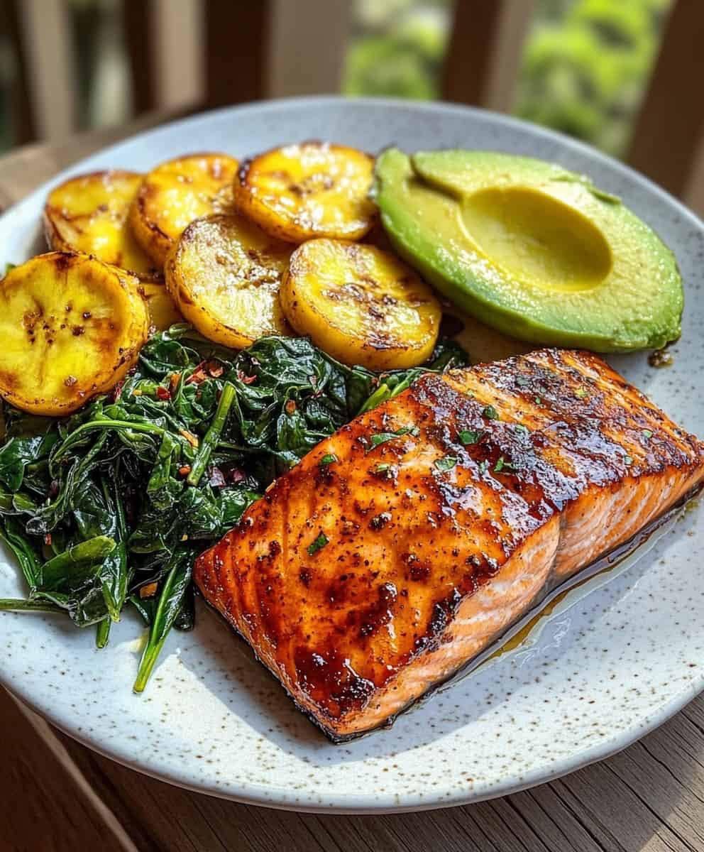 This flavorful, nutrient-rich plate features caramelized honey-glazed salmon, golden fried plantains, vibrant sautéed spinach, and creamy avocado. It’s a balanced, satisfying meal with sweet, savory, and spicy notes—perfect for a wholesome lunch or dinner in just 25 minutes.