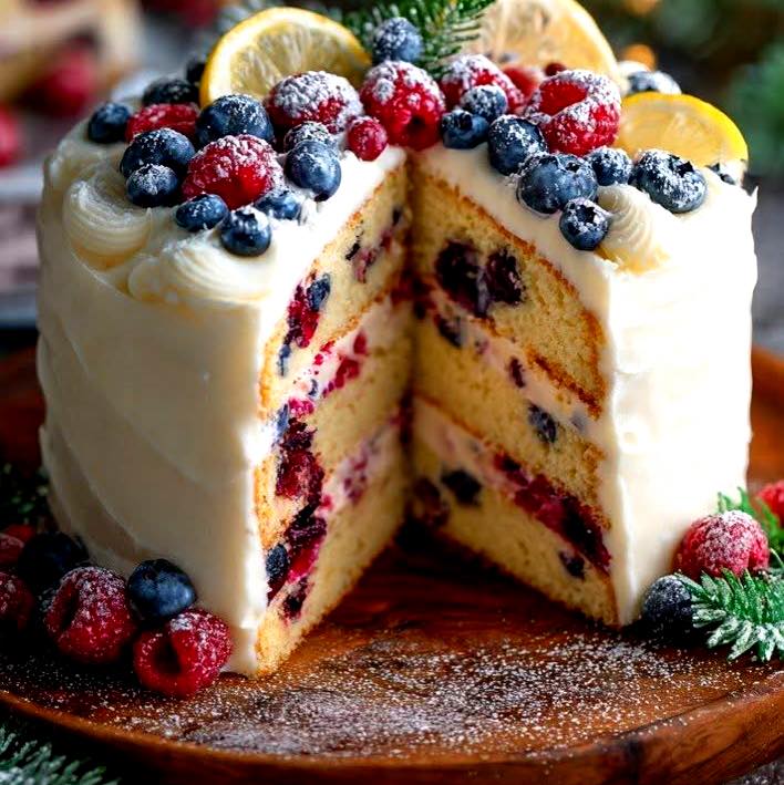 This festive cake blends bright lemon flavor with juicy mixed berries, creating a refreshing yet indulgent holiday centerpiece. Soft, tender cake layers pair beautifully with a tangy lemon-blackberry filling and a smooth, rich lemon frosting. Vibrant berries and lemon slices make it visually stunning for any celebration.