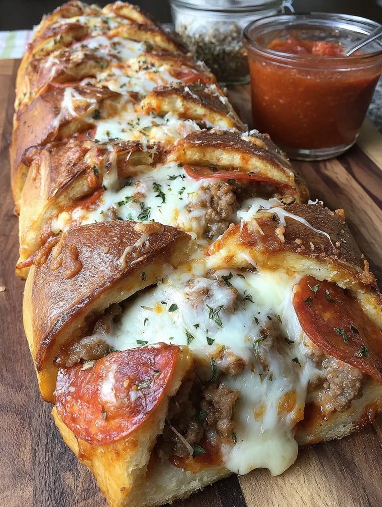 Stuffed, cheesy braided pizza bread loaded with beef, pepperoni, and melty cheese — irresistible comfort food! This recipe takes the classic pizza concept and transforms it into a hearty, braided bread that’s both fun to make and delicious to eat. The combination of lean ground beef, savory pepperoni, and gooey cheese creates a filling meal that’s perfect for lunch, dinner, or even a savory snack. The addition of dried oregano enhances the flavors and gives it that familiar pizza aroma, while the braided bread gives the dish a satisfying texture. Whether you’re hosting a gathering or just craving pizza, this recipe will surely become a new favorite.