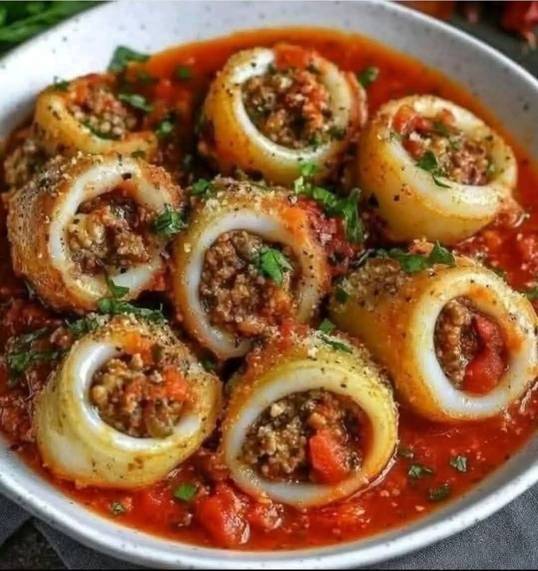 This Mediterranean-style Stuffed Squid in Tomato Sauce is a flavorful dish combining tender squid filled with a rich, herbed meat stuffing, gently simmered in a fragrant tomato sauce. Perfect for a comforting family meal or a special dinner, this classic recipe delivers a beautiful balance of land and sea flavors, enhanced by fresh herbs and a touch of Parmesan.