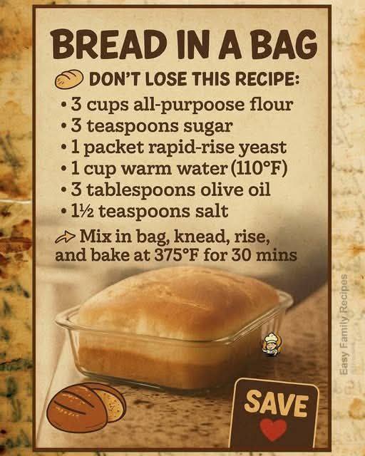 Sometimes, the best bread doesn’t come from fancy mixers or long, complicated recipes — it comes from the heart (and, in this case, a zip bag!). This No-Mixer Bread-in-a-Bag is a true old-fashioned gem inspired by Nana’s kitchen wisdom. It’s soft, golden, and wonderfully simple — perfect for beginners or anyone craving homemade bread with minimal cleanup. All you need is a sturdy zip bag, a few pantry staples, and a little patience while it bakes to golden perfection!