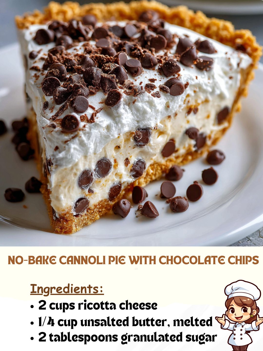 This No-Bake Cannoli Pie with Chocolate Chips is a creamy, indulgent dessert that combines the rich, sweet flavor of ricotta cheese with the satisfying crunch of a graham cracker crust. Topped with chocolate chips and a light, fluffy filling, this pie is perfect for any occasion, and best of all, it’s easy to make without ever turning on the oven. You’ll love every bite of this delightful twist on the classic Italian cannoli!