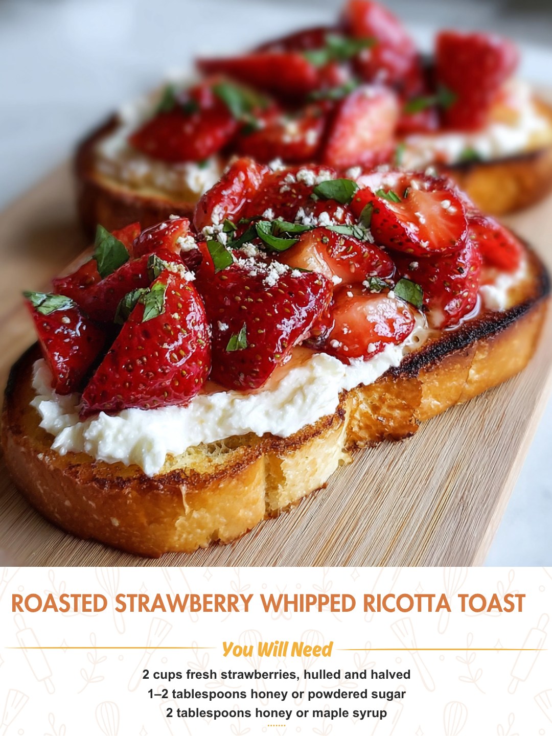 The roasting of the strawberries deepens their natural sweetness and intensifies their flavor, making them the perfect pairing with the smooth and slightly tangy whipped ricotta. A drizzle of honey or maple syrup on top adds a touch of extra sweetness, creating a balanced, indulgent dish that’s simple to prepare yet feels like a special treat. Whether you serve it as a quick breakfast or a more elaborate brunch, this Roasted Strawberry Whipped Ricotta Toast is both beautiful and delicious.