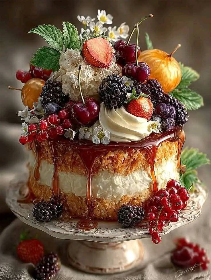 Rustic Caramel Drip Cake with Whipped Vanilla Cream & Fresh Berries β a stunning showstopper dessert that combines moist vanilla cake layers, silky whipped cream, and a golden caramel drip. Topped with jewel-toned berries and edible flowers, itβs the perfect centerpiece for any celebration! π°β¨
