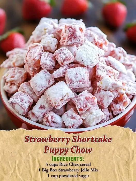 This Strawberry Shortcake Puppy Chow is a fun and delicious twist on the classic snack! With the sweet, creamy flavors of white chocolate, strawberry jello, and powdered sugar, this treat is perfect for any occasion. The Rice Chex cereal provides the perfect crunch, while the combination of ingredients creates a strawberry shortcake-inspired snack that’s irresistible. Whether you’re serving it at a party or enjoying it as an afternoon snack, this Puppy Chow is sure to be a hit!