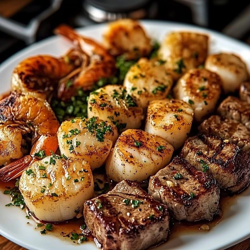 This surf and turf platter brings together juicy steak bites, smoky shrimp, and golden seared scallops, all tied together with a fragrant garlic herb butter. Each component is cooked separately to perfection—high-heat searing for the steak, quick sautéing for the shrimp, and careful caramelization for the scallops—before being arranged into a refined yet comforting trio. The garlic herb butter drizzled over the final platter adds richness, lemon brightness, and a delicate herbal finish, creating a restaurant-quality dish ideal for a cozy fine-dining experience at home.