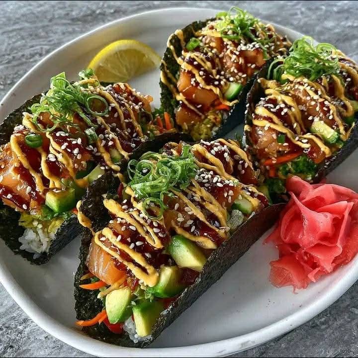 Sushi Tacos ๐Ÿฃ๐ŸŒฟ are a fun, fresh twist on traditional sushi โ€” perfect for a light meal, party appetizer, or sushi night at home. With crisp nori and seasoned rice forming a handheld โ€œtaco shell,โ€ these colorful tacos are filled with sushi-grade fish, crunchy vegetables, and drizzled with a creamy, spicy mayo sauce. Theyโ€™re vibrant, versatile, and ready in just 20 minutes!
