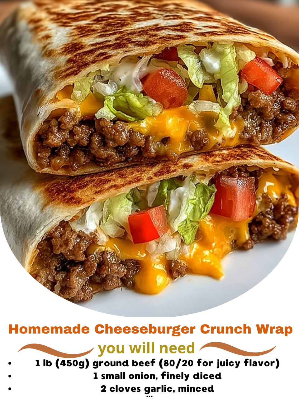 This Ultimate Homemade Cheeseburger Crunch Wrap Recipe combines all the delicious flavors of a classic cheeseburger with a fun, portable twist. Featuring juicy ground beef, melted cheese, and fresh toppings, all wrapped up in a soft tortilla and grilled to crispy perfection, this crunch wrap is a flavor-packed meal that’s as satisfying as it is convenient. Perfect for a fun dinner, lunch, or even a game-day treat, this is a burger like you’ve never had before!
