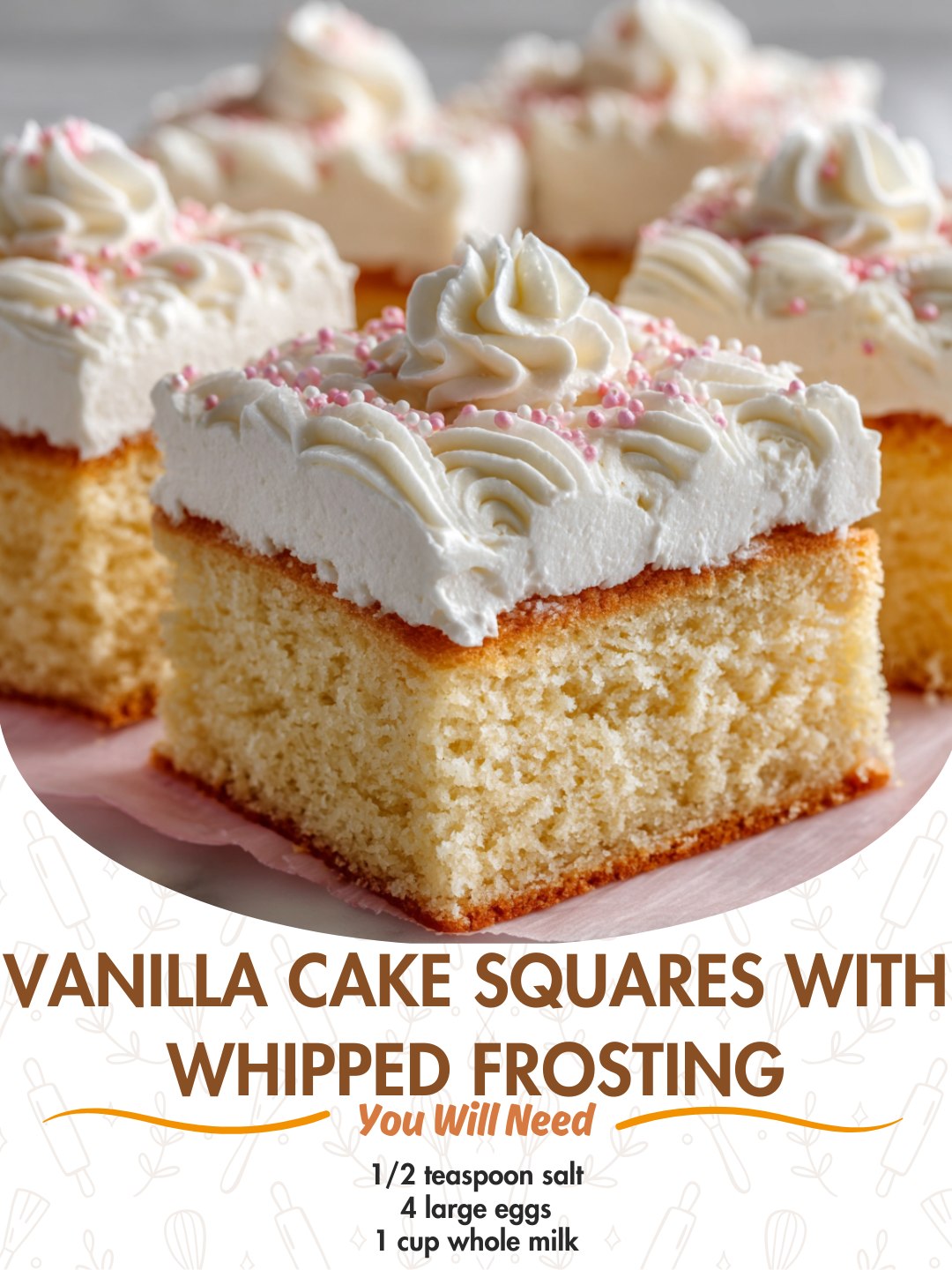 These Vanilla Cake Squares with Whipped Frosting are a light, fluffy dessert that’s perfect for any occasion. The moist, tender cake is paired with a silky, whipped frosting that adds just the right amount of sweetness. Whether you’re serving them at a party, family gathering, or enjoying them on your own, these cake squares are sure to satisfy your sweet tooth!